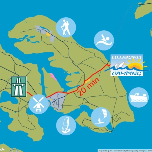 Fra motorvejen køres mod Fynshav på Rute 8 – I Fynshav mod Skovby ad Rute 427 – Efter man har passeret Brugsen, drejes til venstre ad Lillebæltvej og for enden af vejen kommer I til Lillebælt Camping.